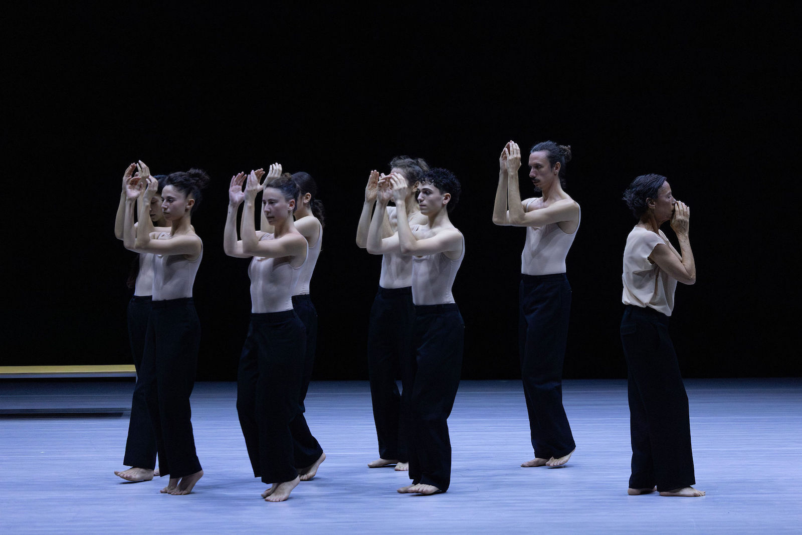 Kima Zuk Fishof and Oraya Nir represent the youngest among us. Exploring, discovering, tender with each other, and yes, captivating. Their acting too innocent to be affected or self-conscious, their bodies youthful with not yet fully developed musculature or core. Her sloping shoulders and flexible spine exhibiting softness and, in surprising flashes, sharpness. Even when sharing the stage with the Zuk-Martini generation, all eyes are on them. I imagine the work of imprinting the complex choreography on their young bodies. I can picture them rehearsing in front of the bathroom sink, walk-dancing down the street, or sitting on the bus marking movement with their hands. Whatever their process, they worked hard enough for it not to look like work at all, natural and unaffected.