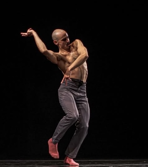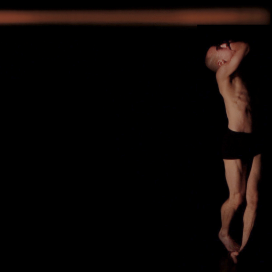 The longed-for blackout finally arrives. While red squares still flicker in my field of vision, the dancer Ariel Gelbart enters the stage, positions himself, and remains in an initial pose. The light returns, this time subdued and dim, allowing the presence of the body to be perceived without yet understanding how it is organized. I wonder what the north of our body is, that anchor which allows navigation and reading of the other darkened limbs. Perhaps the answer is obvious, but it catches me unprepared. Only when I recognize his head and face am I able to complete the puzzle and decipher the full posture. The stage darkens again, and Ariel moves slowly toward the next image. His striking, sculpted body, naked except for black underwear, allows observation of every muscle and sinew, almost like watching a Michelangelo sculpture in motion. Understanding requires time and resources, while the visual experience feeds the imagination from the very first moment. His slow movement stays close to the ground and allows appreciation of a body that is mass, image, and at the same time an ongoing process of transformation. In the background, sounds reminiscent of animal and bird calls are heard, not always pleasant, creating a sense of being in untamed nature.