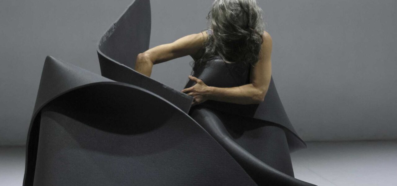 A grey lump made of Polygal material, folded into several disorganized layers, moves toward us. We don’t see Noa, only the lump. In the background, we hear a recording, a woman’s voice. “All at once, fold yourselves and go: ahhhhhhhhhhh.” I really wanted to follow the instruction, but it’s not acceptable, or maybe the relationship between the performer and audience is still just forming, so I did it in my heart. To release the tension built up from everyday life, from the accumulation of the day we’ve had, which we, the audience, always bring with us to a show, like the accumulation of our personal histories that always reside in our body’s cells. Noa stands, folded beneath the grey material. Only her legs and a head peek out. Noa pulls herself forward by her hair.