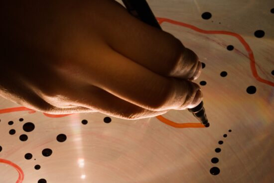 At a climactic moment, when the projected image threatens to overflow and the stage is almost completely filled, Ayala returns to the stage and paints directly, with brush and pigment, onto Naya’s body. It is a striking and unusual moment, and I hoped it would return later on. It expands the creative dialogue into further dimensions: the material body and its reflection; the painted material and its reflection; the illustrator’s gestures, and at rare moments even the reflection of her hand catching my eye.
