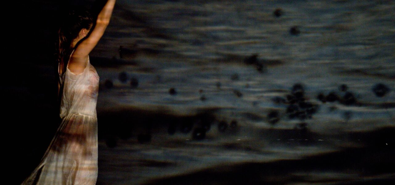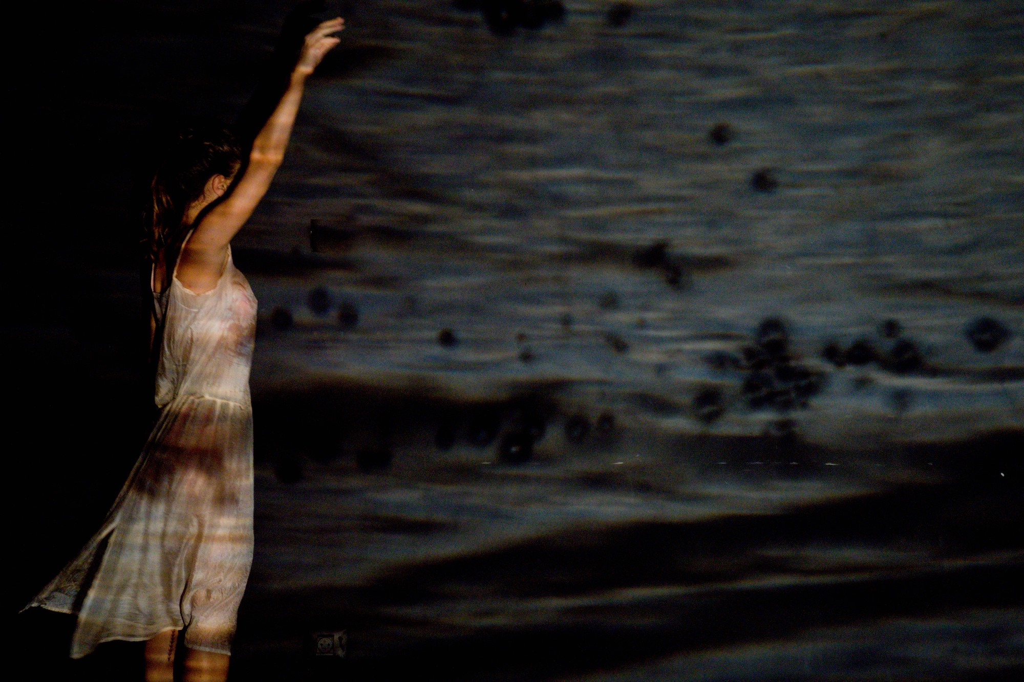 The worlds oscillate between the tangible and the abstract, as Ayala employs a variety of materials and textures. Naya’s persona shifts as well, both through the costumes and accessories she adopts in each world, and through her movement choices, which range from the one end of classical flamenco to the other end of contemporary dance. Between these two poles lie countless fascinating points, creating a unique choreographic language. In a particularly powerful scene, Naya presses herself against the back wall, the stage empty and silent. Ayala places a large stone at center stage. Then another, on top. And another. The stones look heavy and threatening. How does she manage to balance them? I wonder, then remind myself that what seems to rise upward is in fact on the same plane (depth). Yet even this logical understanding, like a child who figures out how the trick works, does not stop me from being moved by the magic again and again. Naya fights for her right to exist as the stones close in around her. And though the background music comes from another world, I can’t help but think of PJ Harvey’s song Dear Darkness: