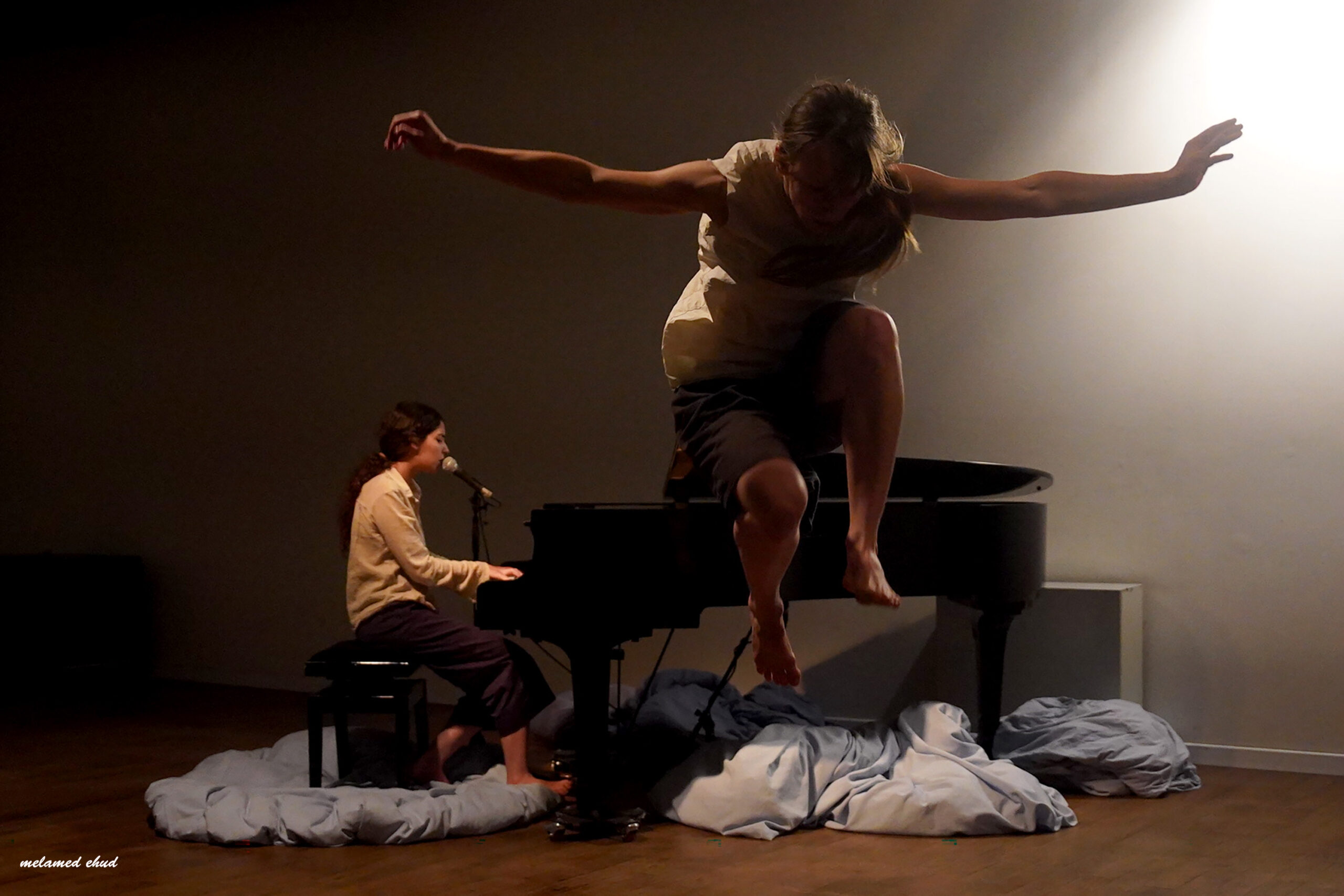 כך נפתח “סכר” שיצרו הרקדנית והכיריאוגרפית עלמה קרבט שמש והמוזיקאית והזמרת שרי זק לוי. שמו של המופע נגזר משירה של המשוררת יונה וולך, אותו הלחינה שרי ויושר בקולה בהמשך. עד אז עלמה נאבקת עם החומר, אתה שומע את ההתנשפויות שלה בעוד היא מתאמצת עד כאב, לא מרפה מנסיונותיה- רק כדי לדמיין. את טיבו של החומר אתה לא מגלה, הוא נעלם, רק מעשה ההתעקשות נותר והוא פוער לך פתח שבו אתה חושב כמעט אחרת. כשהיא מתמוטטת בין השמיכות שרי עולה לבמה, מתיישבת על הפסנתר, מנגנת ושרה את השיר הראשון במופע.