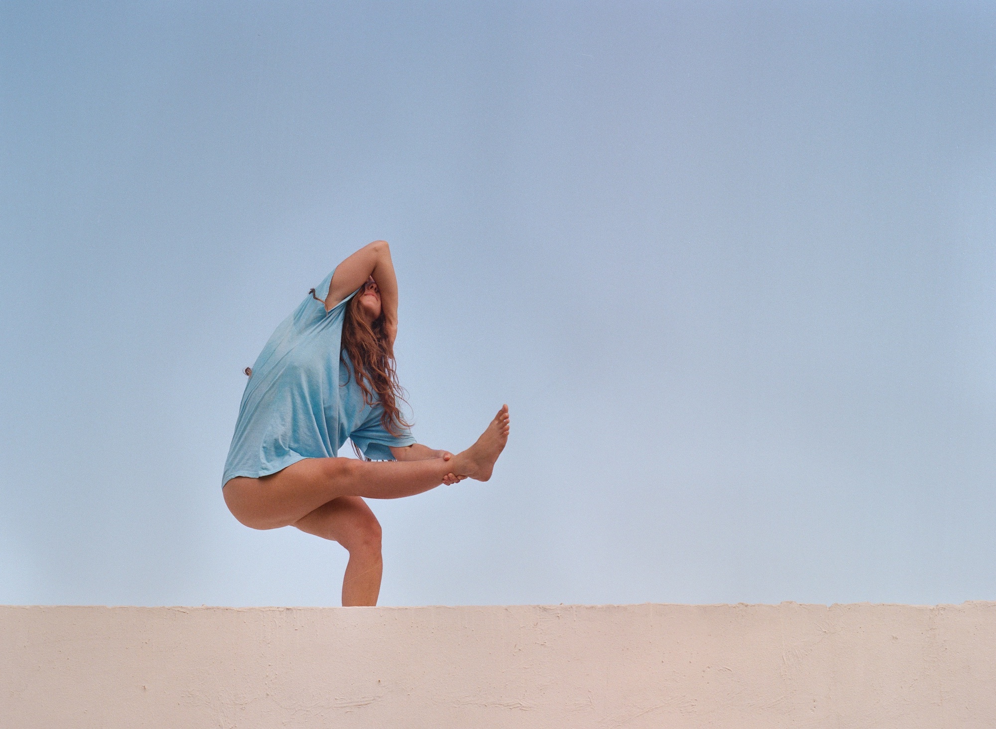 She presents different challenging situations for the body. She enters one state and then another and another in a sequence that is not organic sometimes rigid not dance like not flattering. She trips herself up and then trips again. She throws herself from the knees lands on half the thigh one leg stretched forward and one hand as well as if trying to compare the parts of the body their lengths perhaps their abilities.